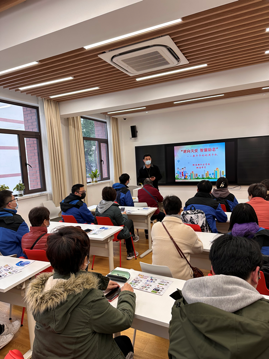 12月2号上午,来自桃浦中学的八位高中生来到桃浦镇社区学校二楼共享教室,手把手的教爷爷奶奶学习智能手机的日常使用。来自樱花苑的老年居民朋友参加了本次活动。